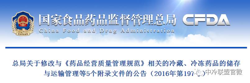 12月29日,国家食品药品监督管理总局发布了关于修改与《药品经营质量管理规范》相关的冷藏、冷冻药品的储存与运输管理等5个附录文件的公告(2016年第197号),内容如下: