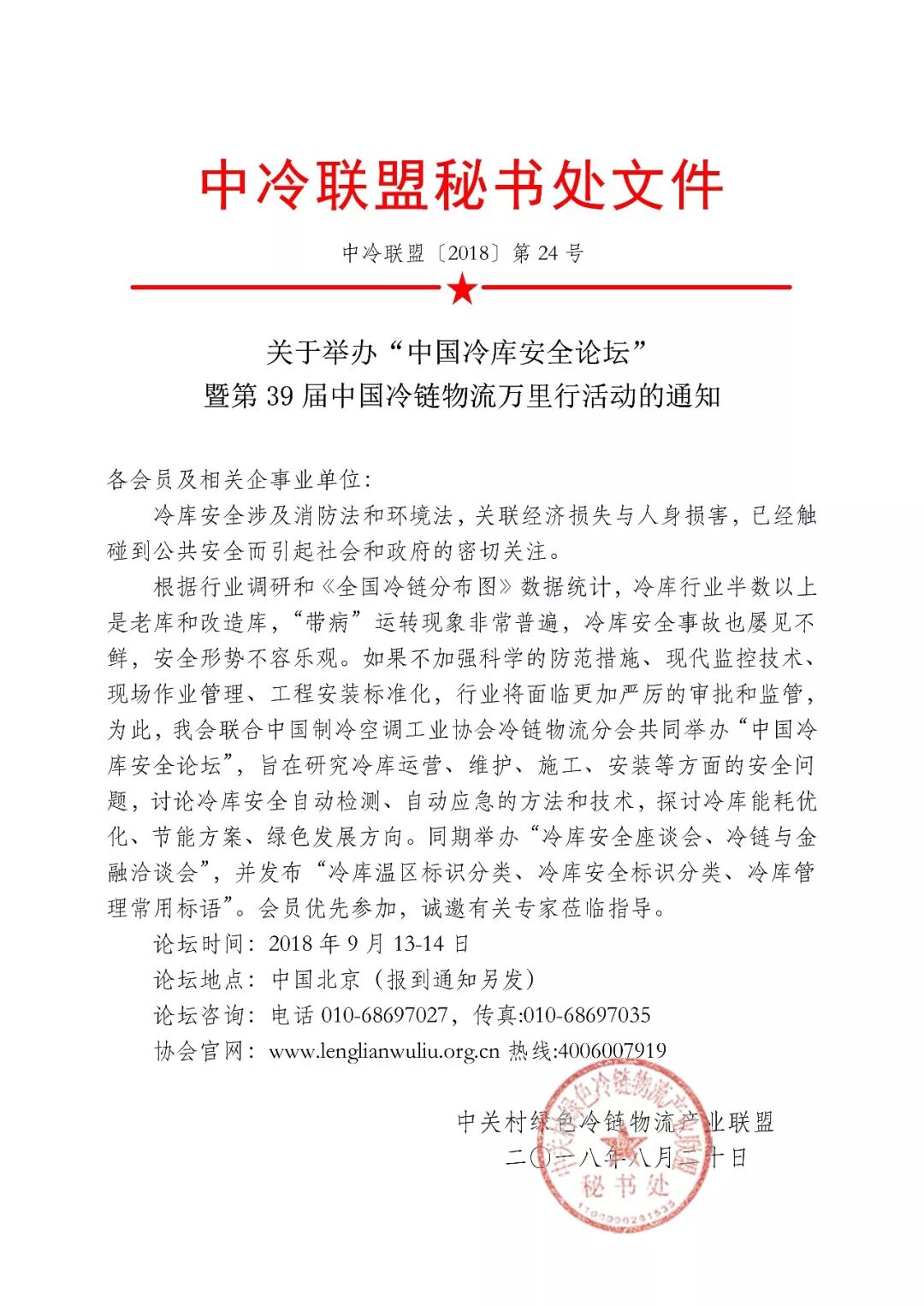 关于举办“中国冷库安全论坛” 暨第39届中国冷链物流万里行活动的通知