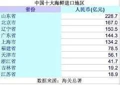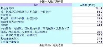 而最受中国市场欢迎的十大进口海产品品类分别是:冻对虾,活、鲜或冷的岩礁虾和其他龙虾,冻狭鳕鱼,活、鲜或冷的蟹,鲜或冷的大西洋鲑鱼,冻鳕鱼,冻的墨鱼及鱿鱼,活、鲜或冷的鳌龙虾,冻鲶鱼鱼片和冻格陵兰庸鲽鱼。