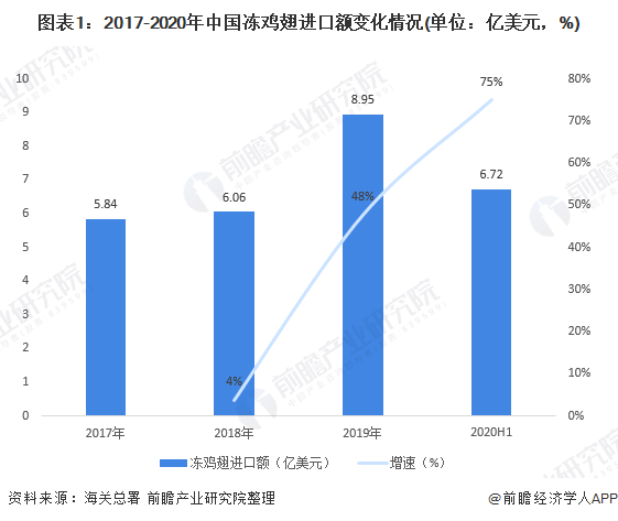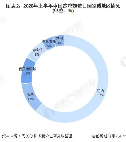 据统计,2019年,中国海鲜进口激增39%,达到1,060亿元人民币(156亿美元),成为仅次于美国的全球第二大水产进口国。这是一个千亿元级的市场,而2020年本来的预期是1000万吨。甲壳类:中国进口了价值70.3亿美元的甲壳类动物,占中国海鲜进口总量的45%。加上软体动物,如鱿鱼、章鱼等,进口额上升到85.9亿美元,占总进口的55%。中国最大的进口甲壳类动物是虾,包括冷冻、活的或新鲜的冷水和温水虾。2019年,中国进口的虾增加了近两倍,达到71.8万吨,价值44.4亿美元,厄瓜多尔和印度是中国最大的虾供应国。我们再看一下我国冷冻鸡翅进口的数据,从我国冻鸡翅进口情况看,近年来,我国冻鸡翅进口额增长幅度大,2020年上半年,我国冻鸡翅进口额达到6.72亿美元,同比增长75%,增幅较大。